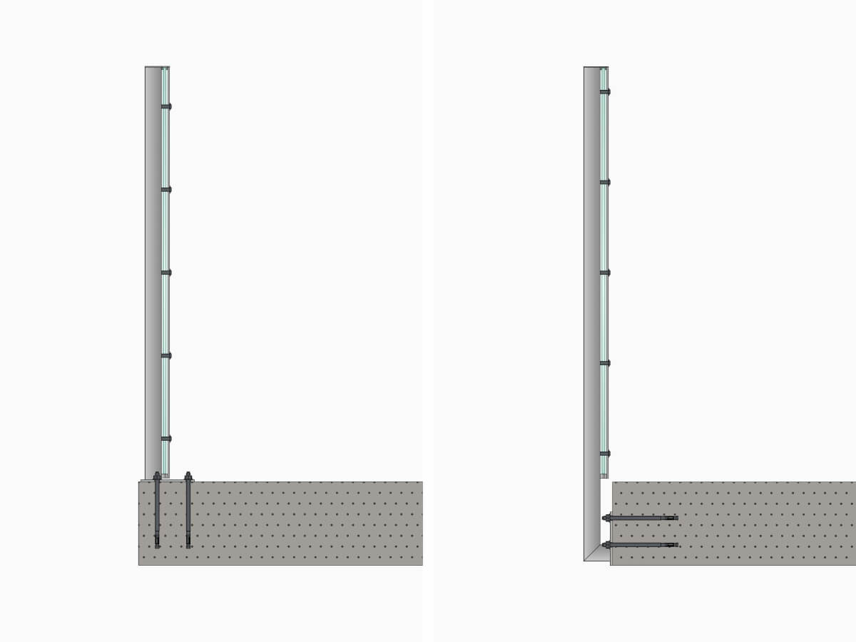 Zur aufgesetzten Montage wird die Pfostenlänge bei Bedarf entsprechend Ihrem Bodenaufbau angepasst. Bei der vorgesetzten Montage wird das System standardmäßig so konstruiert, dass die Glaselemente nahezu auf Bodenhöhe abschließen. Die Befestigungen werden dabei mittig auf der Betonplatte platziert.
