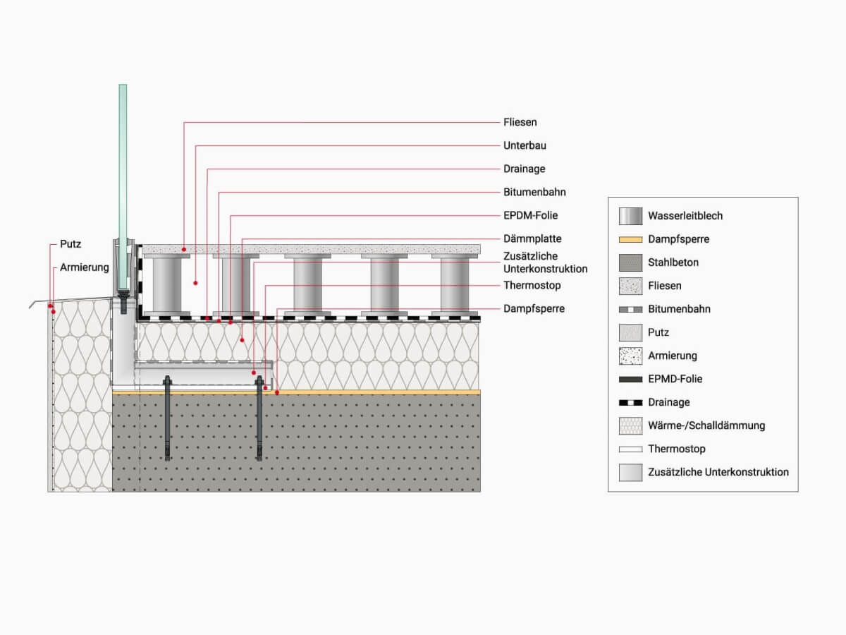Im Falle eines erhöhten Bodenaufbaus bieten wir Ihnen auf Anfrage für das System FORMAL eine optimale statisch geprüfte Lösung nach Maß. Diese ermöglicht das Abdecken eines Bodenaufbaus von bis zu 374 mm und kommt vor allem zum Einsatz, wenn der Balkon barrierefrei und nahtlos zum Wohnbereich angebunden werden soll. Denn: Ist im Haus eine Fußbodenheizung verbaut, erfordert dies auf dem Balkon ebenso einen höheren Bodenaufbau. Die speziell für FORMAL entwickelte Unterkonstruktion zur aufgesetzten Montage ermöglicht ein bündiges Montieren zur Außenkante des Fundaments.