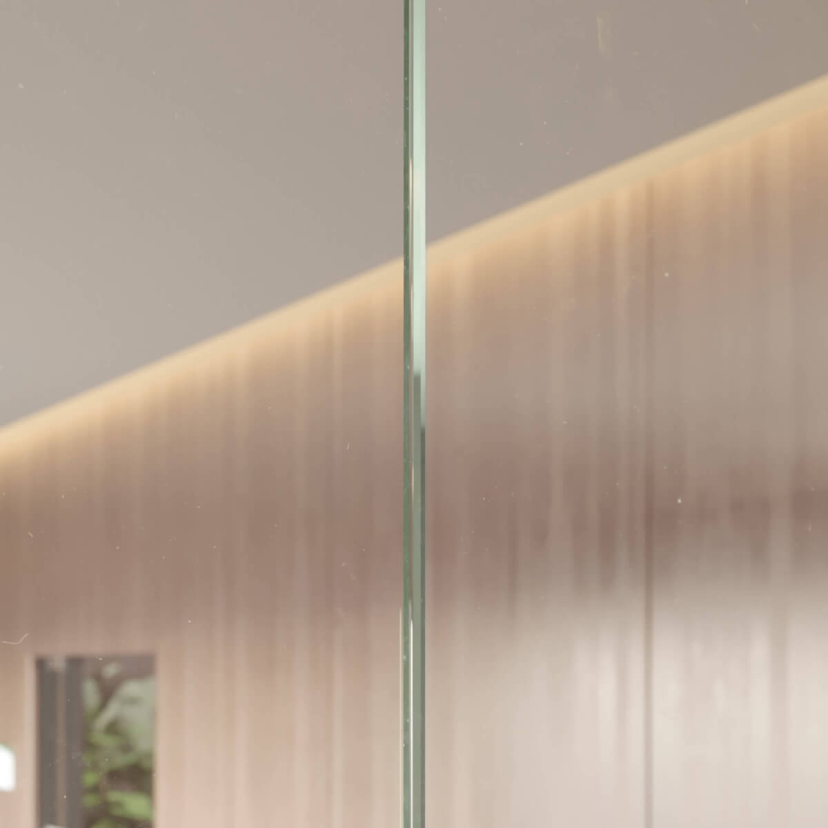 Die filigranen Aluminium-Klemmprofile unserer Glastrennwände unterstreichen mit nur 42 mm die Leichtigkeit der Konstruktion.