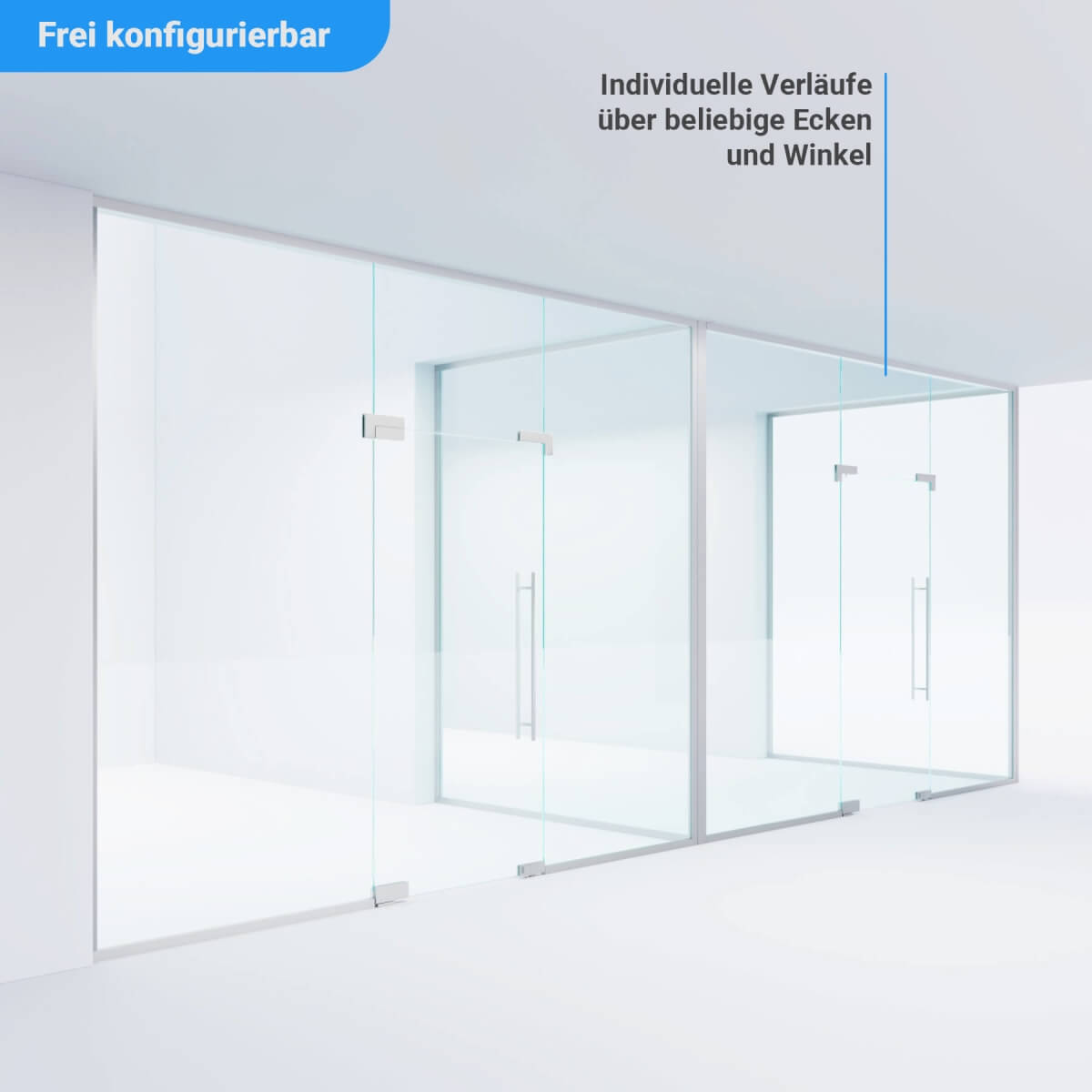 Mit unseren Glastrennwänden lassen sich sowohl gerade Verläufe als auch größere, komplexe Trennwandverläufe über Eck oder sogar ganze Raumkonzepte realisieren.