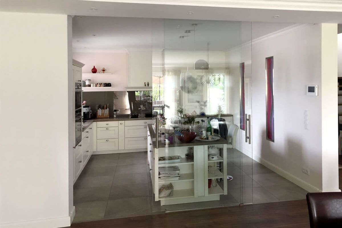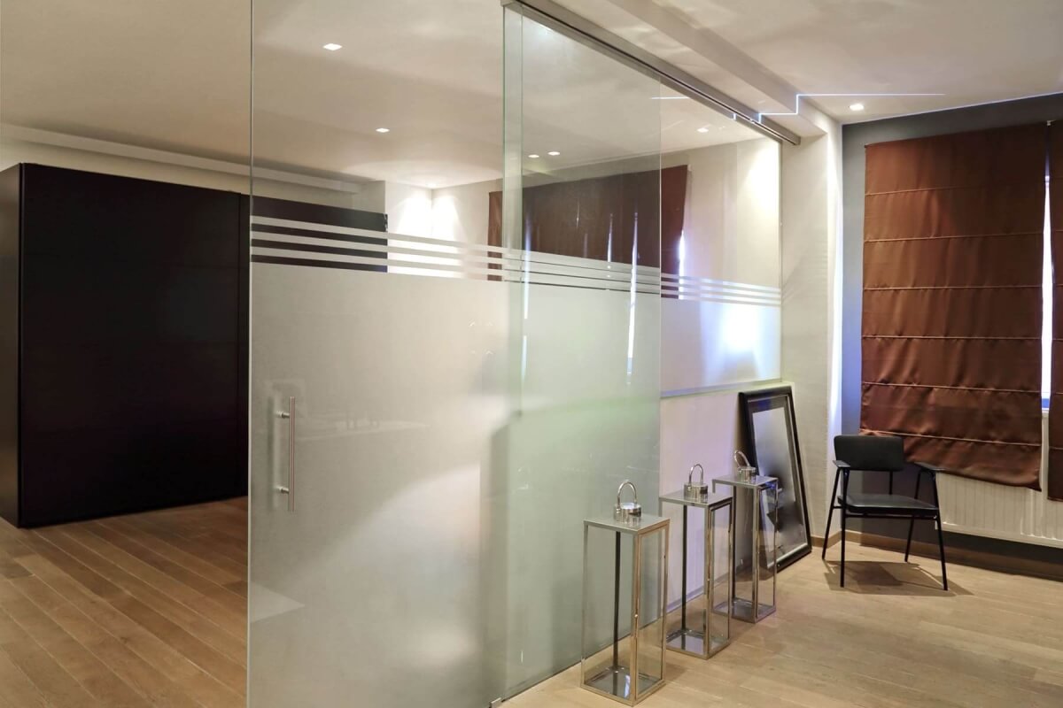 Bei uns können Sie sowohl die Befestigungspunkte und Aufteilung Ihrer Glastrennwand als auch die Anzahl der Schiebetürflügel frei wählen. Bei zweiflügeligen Schiebetüren ist eine asymmetrische Aufteilung möglich. Die Anfertigung erfolgt exakt nach Ihren Maßen, wobei die maximale Höhe bei 300 cm liegt. Für die festen Elemente stehen neben der Fixierung mit Silikonkleber auch Klemm- und U-Profile zur Auswahl.