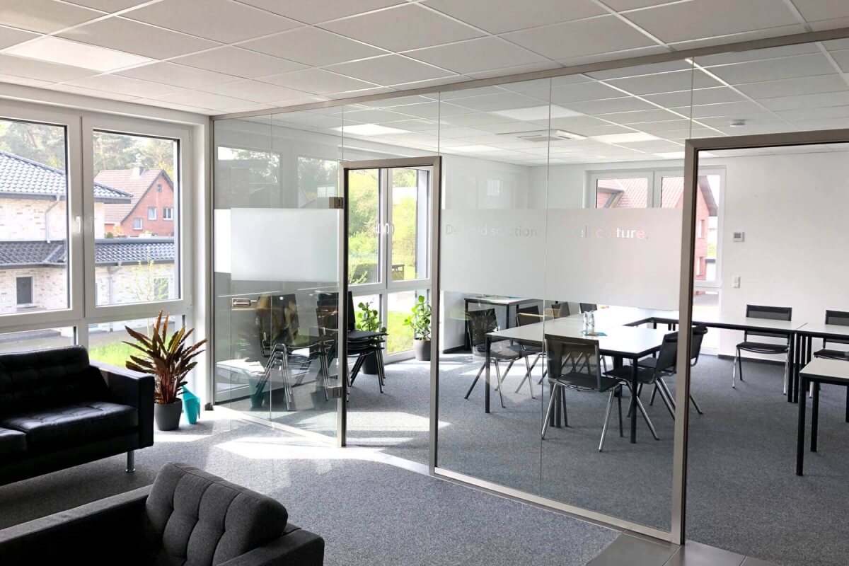 Mit unserem System können Trennwände beliebig aneinandergereiht, Eckverläufe gebildet und T-förmige Verbindungen hergestellt werden. Die Gläser können dabei auf Stoß montiert oder mit Profilen aus Kunststoff oder Aluminium verbunden werden.