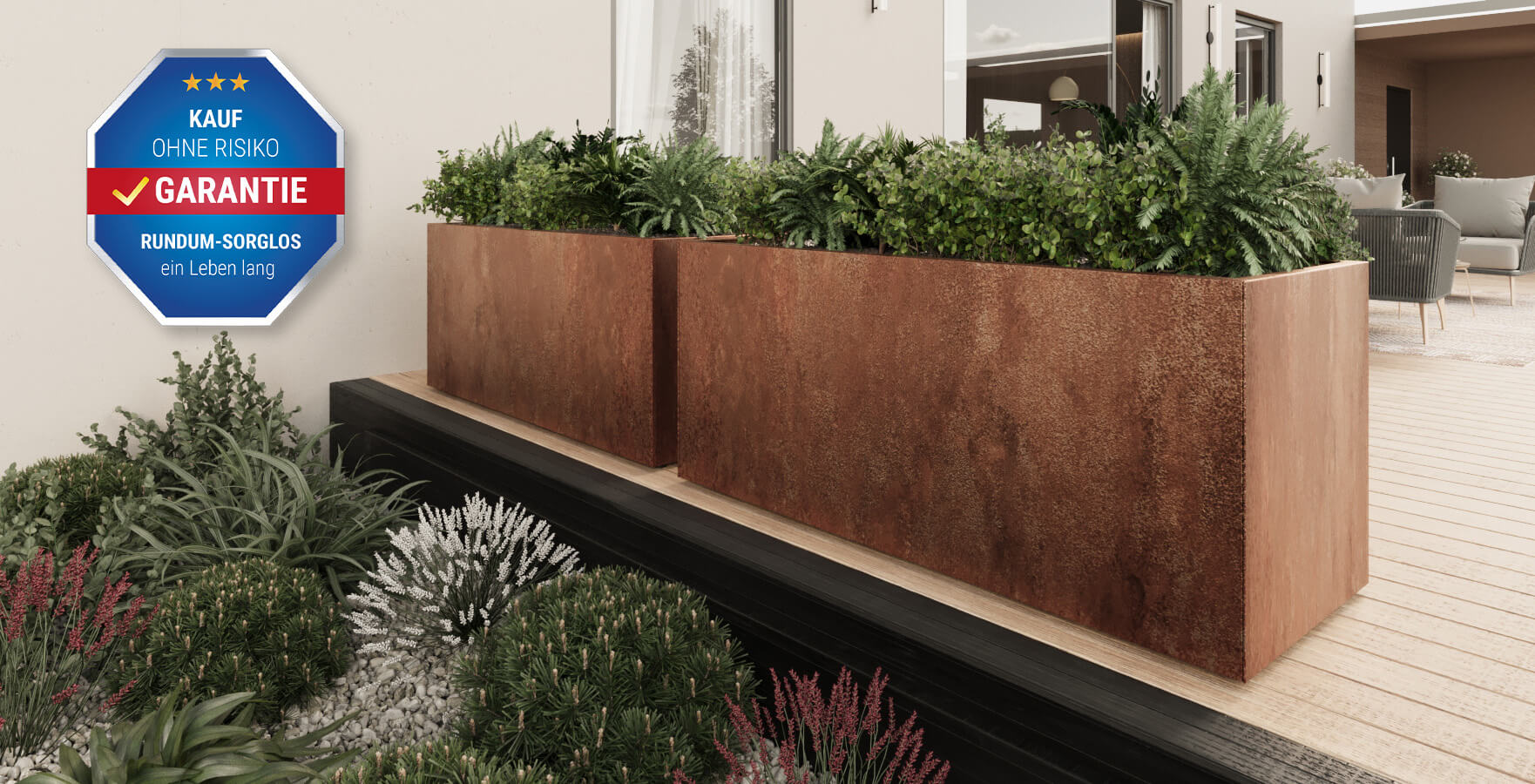 Robuste, matt gebürstete Elemente aus Edelstahl oder aus Cortenstahl (formschlüssig miteinander verbunden, keine Schweißnähte von außen, Stärke: 1 mm)