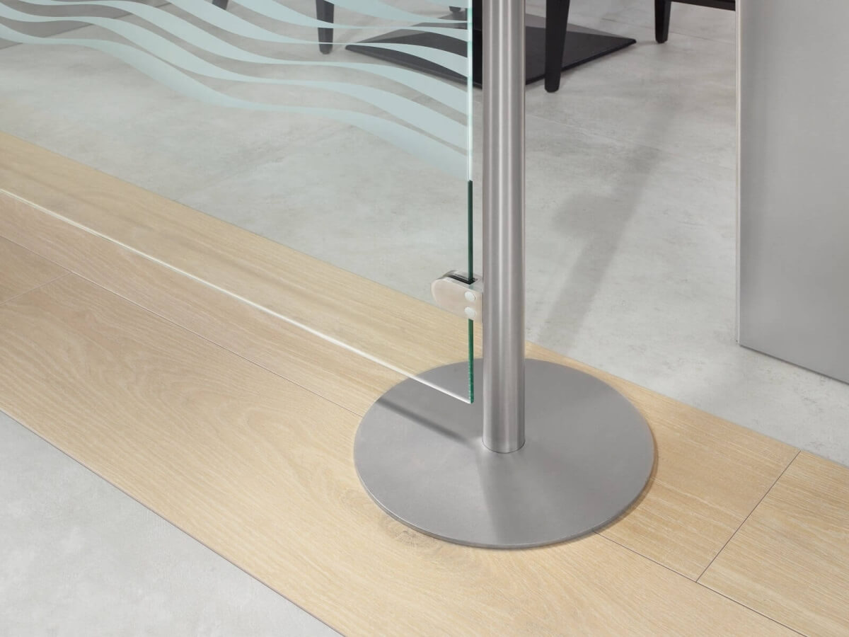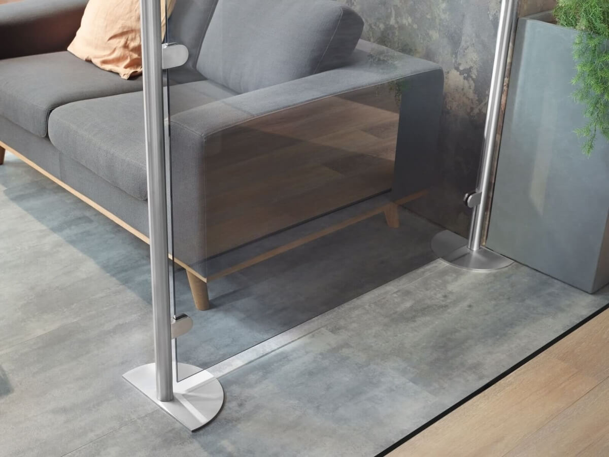 Die großen Tellerfüße verleihen der Glaswand POSTO einen sicheren Halt. Das Modell lässt sich bei Bedarf beliebig im Raum bewegen.