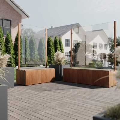 Ja, für flexible Lösungen gibt es mobile Systeme, bei denen Glas Sichtschutzelemente mit Pflanzkästen, mit Bank oder Rollen kombiniert werden. Diese Variante ist ideal für Mietwohnungen oder Bereiche, in denen der Sichtschutz nur zeitweise benötigt wird.